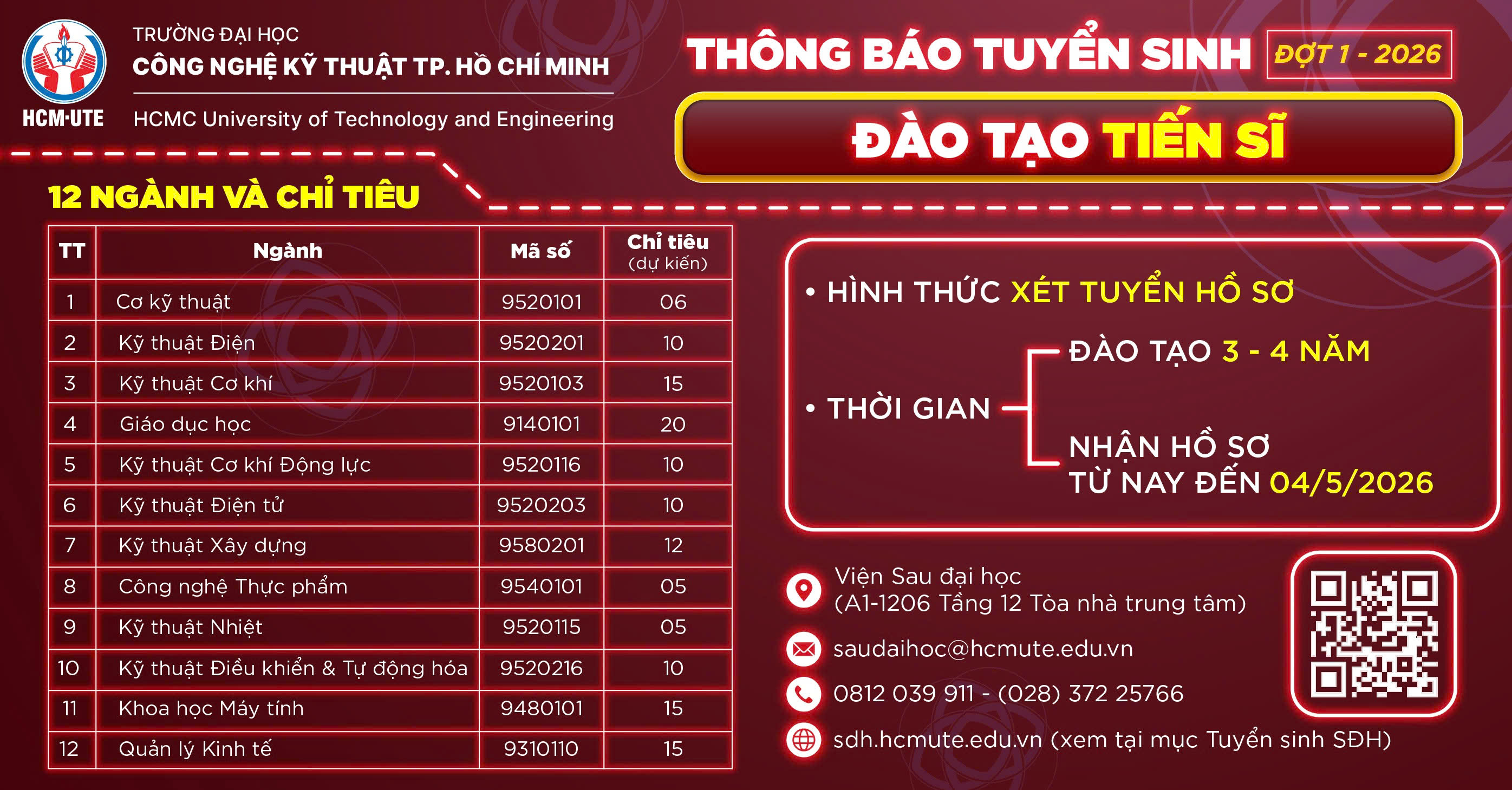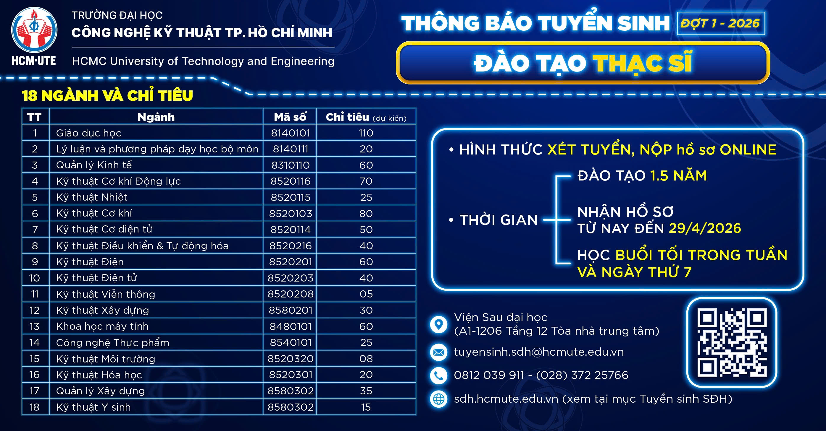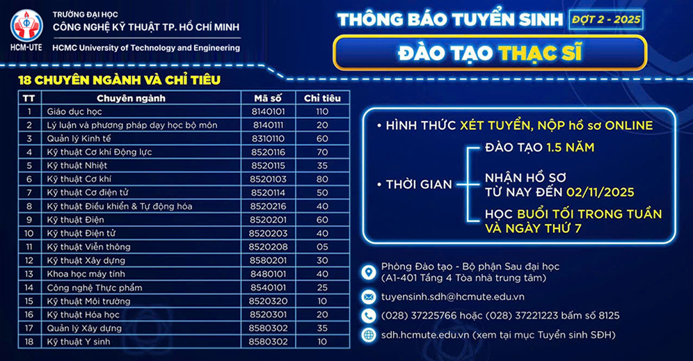 Điện thoại: (+84.8) 37225766 hoặc 37221223 (số nội bộ 8125). E-mail: saudaihoc@hcmute.edu.vn